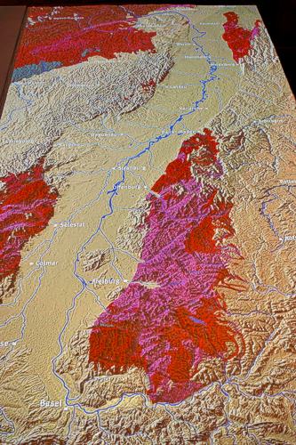 Das sechs Quadratmeter große Modell zeigt ein dreidimensional herausgearbeitetes Relief der Region Oberrhein – von Basel bis Frankfurt. Das eigens für das Naturkundemuseum angefertigte Modell lädt alle Besucher ein – Jung und Alt, Laien und Fachleute – die Landschaft am Oberrhein aus ganz verschiedenen Blickwinkeln zu betrachten.