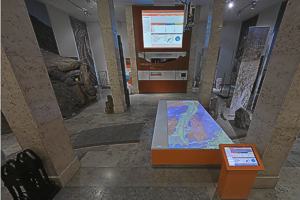 Jeder Besucher kann nach Lust und Laune per Touchscreen verschiedene thematische Karten auf diese Oberfläche projizieren und viele bemerkenswerte geografische Informationen abrufen. Wie sah der Rhein vor der Begradigung aus? Welche Gesteine finden wir am Oberrhein, und aus welchem geologischen Zeitalter stammen diese? Wie ist der Oberrheingraben eigentlich entstanden? Wo gibt es die stärksten Erdbeben? Wo sind die Niederschläge am höchsten, wo am niedrigsten? Wie hoch sind die mittleren Jahrestemperaturen in den verschiedenen Naturräumen am Oberrhein? Bleiben in Karlsruhe die Füße trocken, wenn an den Hängen des Mittelrheintals doch wieder ein Vulkan ausbrechen und sein Lavastrom den Rhein aufstauen würde?