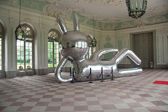 (ssg) Ein spiegelnder Riesenhase im Jagdsaal von Schloss Schwetzingen: