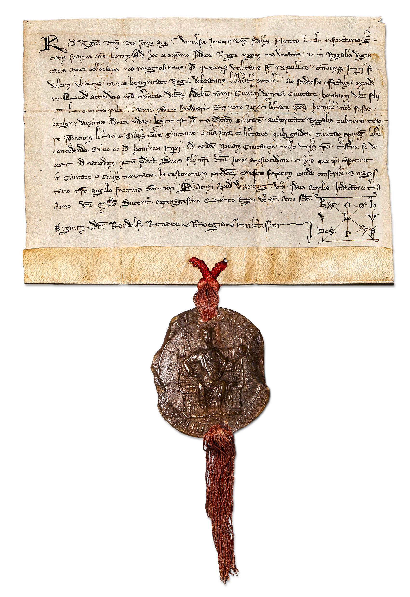 Stadtrechtsurkunde König Rudolfs I. für die Stadt Neustadt an der Weinstraße.Stadtarchiv Neustadt an der Weinstraße. Foto: Historisches Museum der Pfalz Speyer / Julia Paul