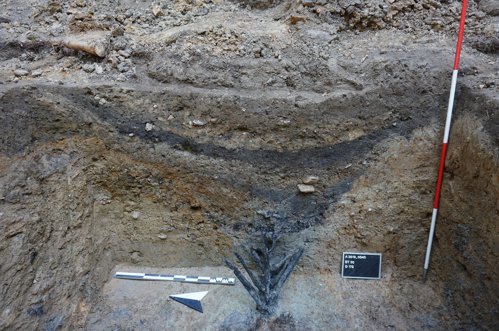 Bild 3: Eine große Überraschung erlebten die Archäologen in den letzten Tagen der Grabungskampagne: Im feuchten Boden des Berges „Blöskopf“ hatte sich eine Konstruktion aus hölzernen Spießen erhalten, die potenzielle Angreifer abschrecken sollte. (Foto: Auth)
