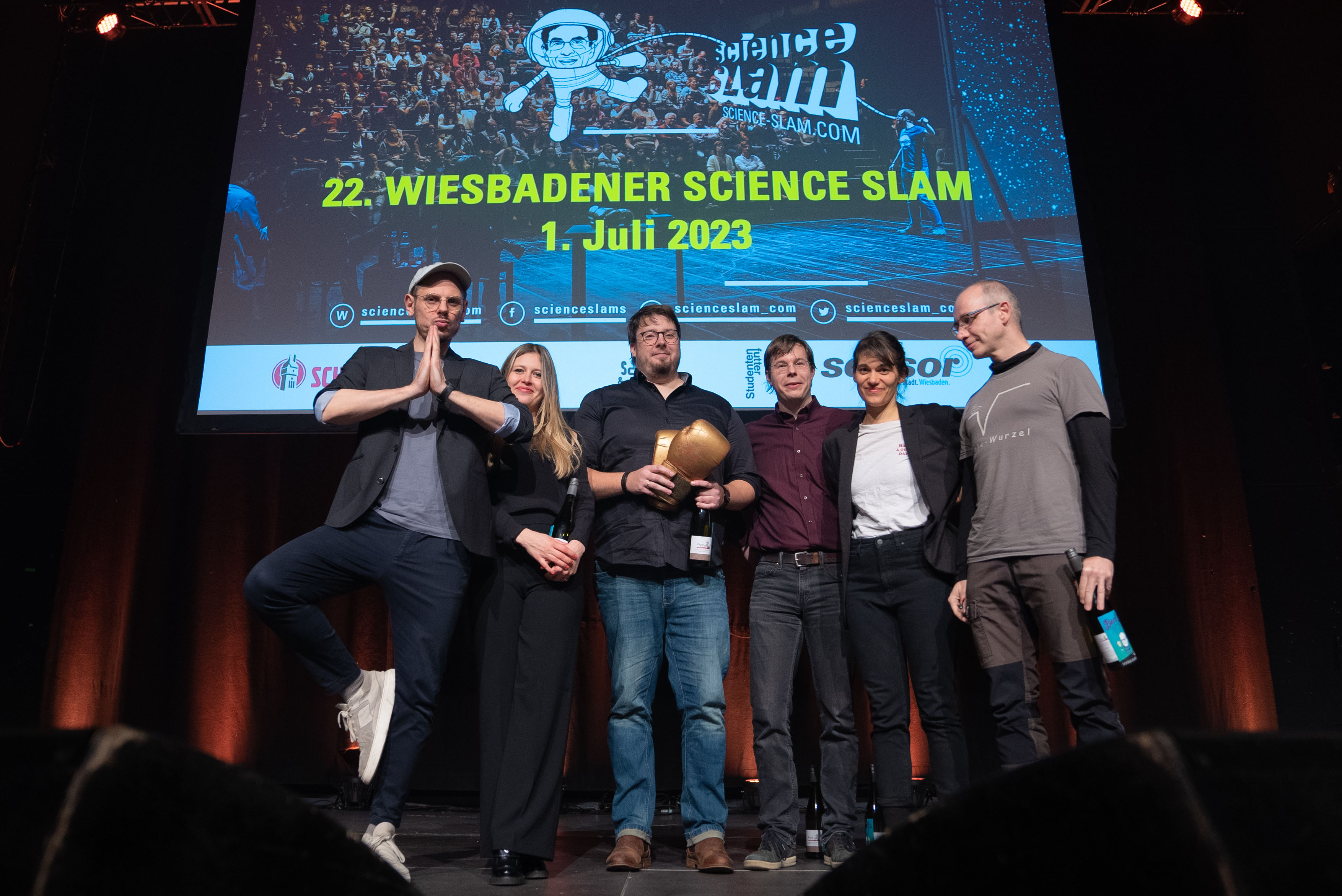 Bild 5: Konnte sich im interdisziplinären Bewerberfeld beim 21. Wiesbadener Science Slam durchsetzen: Archäologe Frederic Auth (3. von links) von der Goethe-Universität mit Moderator Rainer Holl (von links) und den Science Slammern Maria Bruhnke, Christopher Synatschke, Nina Lanzer und Uwe Gaitzsch. (Foto: science-slam.com)