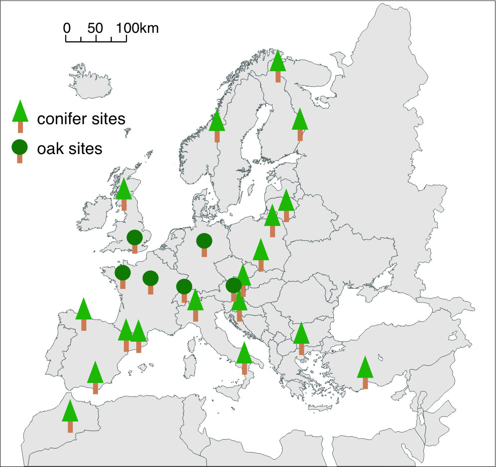 Standorte der Bäume für die Isotopen-Analyse, verteilt über ganz Europa (Abbildung: G. Helle / GFZ)