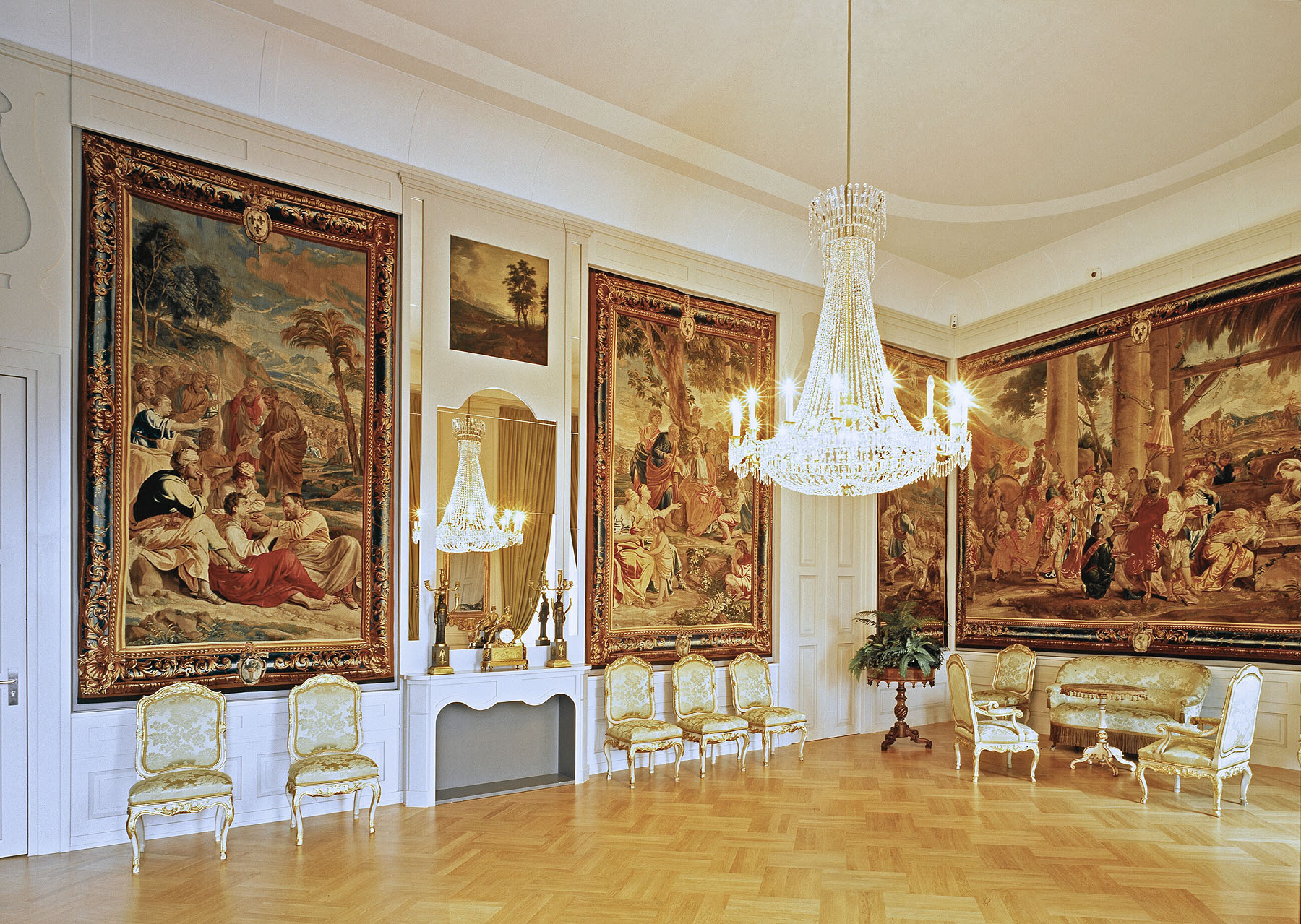 Tapisserien mit biblischen Motiven im ehemaligen kaiserlichen Schlafzimmer des Mannheimer Schlosses, ab 1857 als Empfangssalon der Großherzogin Luise von Baden genutzt. Foto: Dirk Altenkirch, SSG