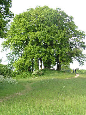 Gruppe von mehreren, nahe beieinanderliegenden Großsteingräbern. Sie ist schon von weitem am Baumbewuchs zu erkennen.