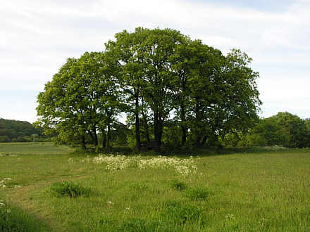 Gruppe von mehreren, nahe beieinanderliegenden Großsteingräbern. Sie ist schon von weitem am Baumbewuchs zu erkennen.