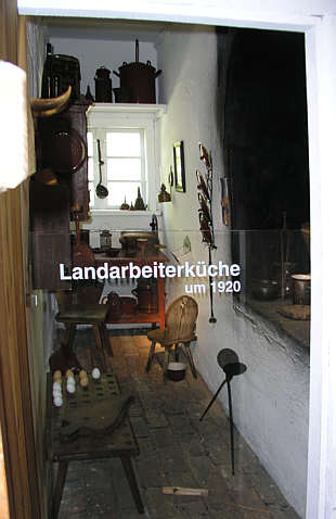 Küche mit offenem Herd, als eigener schmaler Raum innerhalb der Raumflucht. Der Herd in die Wand eingetieft. Eingerichtet als "Landarbeiterküche um 1920".