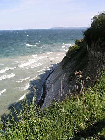 Blick von der Aussichtsterrasse nach Südosten auf die Steilküste. Im Hintergrund die Küste von Lohme.
