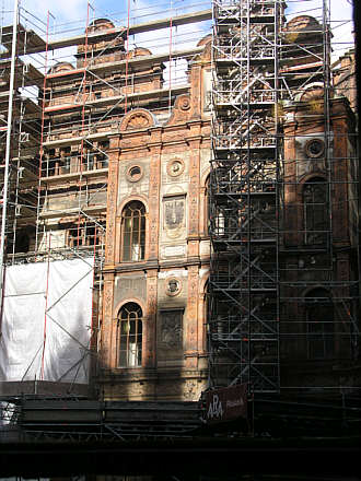 Schlossgartenflügel (1553-55), Schlosshofseite: Terrakottaarchitektur an der Obodritentreppe.