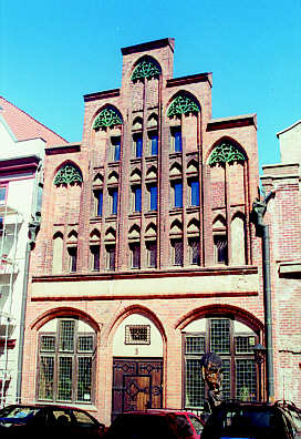 Gotisches Kaufmannshaus mit offener Diele im Erdgeschoss und Speicherräumen in den Obergeschossen, 1975 -79 von polnischen Restauratoren wiederhergestellt.
