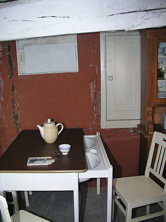 Ess- und Spültisch in der Küche, im Hintergrund der halbhoch gelegene alte Zugang zur Stube.
