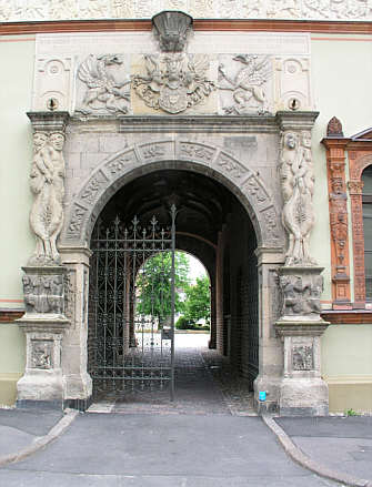 Straßenseitiges Portal, links und rechts verschlungene Satyrpaare, über der Durchfahrt ein von Greifen gehaltenes Wappen.