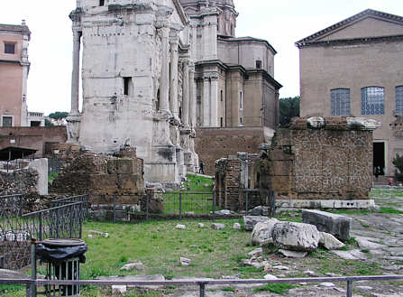 Seitenansicht der Rostra, im Hintergrund der Septimius-Severus-Bogen
