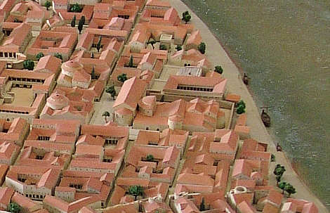 Modell der antiken Stadt mit den sog. Konstantinsthermen (im Zentrum), links daneben der Präfektorenpalast, ganz links am Bildrand das Forum