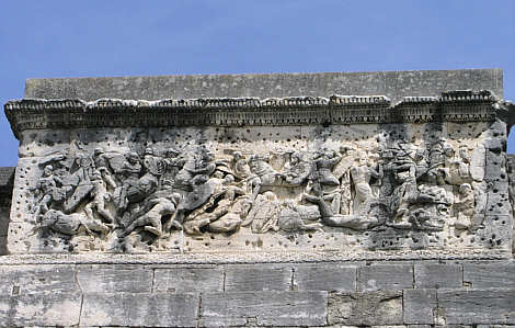 Der Fries an der Attika enthält die Darstellung eines Reiterkampfs zwischen Römern und Kelten, wobei die Figuren einerseits übereinander angeordnet sind, anderereits aber auch in perspektivischer Tiefenwirkung.