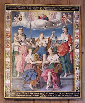 davor Pax und Ceres als die Personifikationen der Tugenden Gerechtigkeit,
