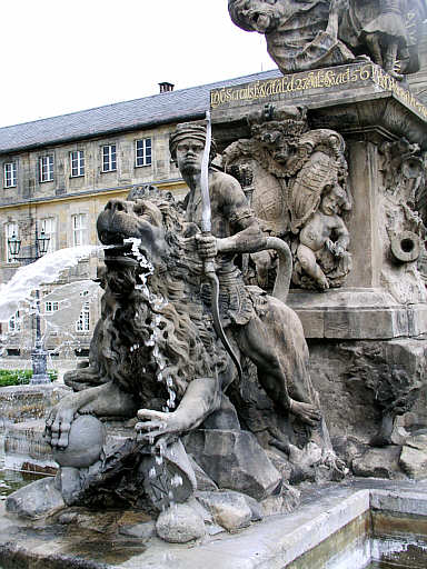 Ein Farbiger mit einem Bogen auf einem Löwen, steht für Afrika und die Naab (und den Süden),