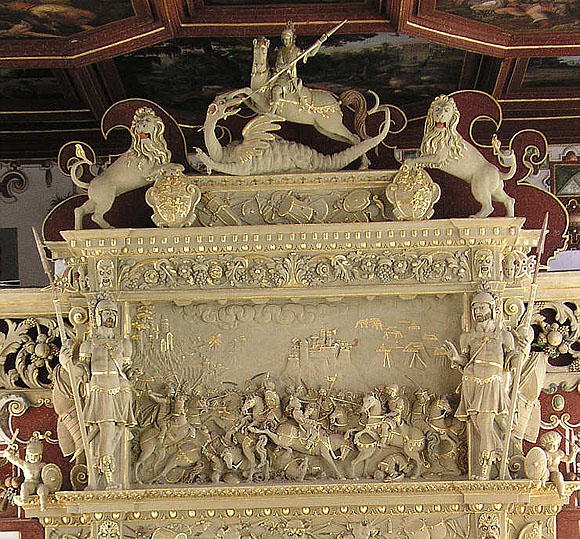 Darüber die Portalbekrönung mit dem Heiligen Georg, dem Schutzpatron