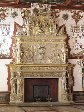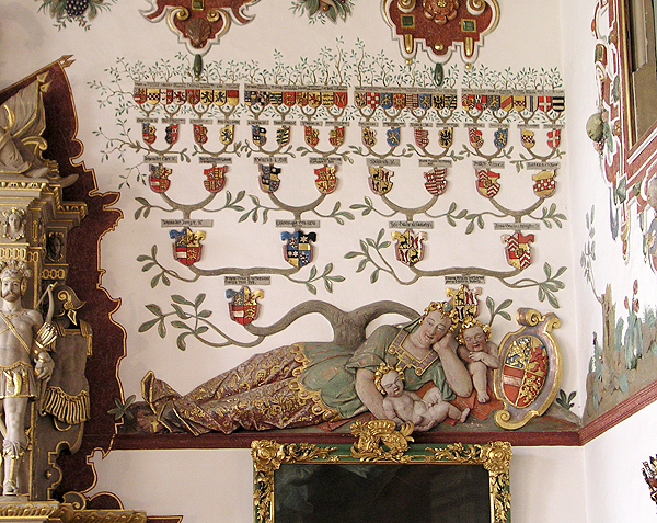 Rechts und links des Kamins die Ahnenreihe des Bauherrn, in der sich seine Legitimität als regierender Fürst manifestiert. Graf Wolfgang von Hohenlohe (1546 - 1610) liegt hier, in Umkehrung des Bildes von der Wurzel Jesse, als der, in dem sich der Hohenlohische Stamm vereinigt. Rechts des Kamins entsprechend die Ahnenreihe seiner Ehefrau Magdalena.