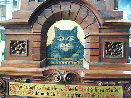 Karlsruhe, vor 1887 Detail: Der Kater Hidigeigei mit dem Zitat "Dulde tapfres Katerherze, Das so Vieles schon erduldet, / Duld auch dieser Jungfrau Blasen!"
