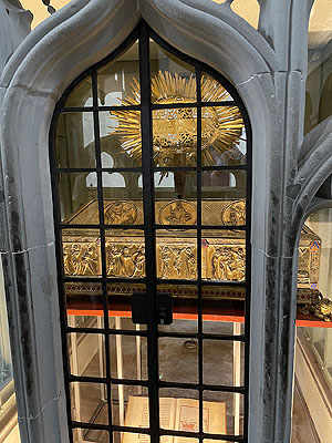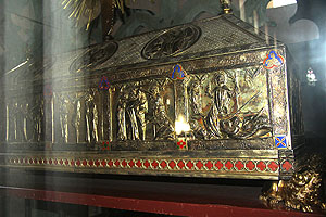 Unten: Blick in den Altar auf den mit Silberplatten belegten Reliquienschrein, dieser in Großaufnehme links unten.