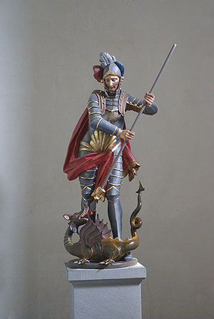 Reichenau, Klosterkirche Oberzell, InnenansichtDer aus Kappadokien stammende und 303 enthauptete Georg gilt in der Ostkirche als "Erzmärtyrer", sein Kult ist in Rom erstmals 683 nachgewiesen. Dem Heiligen geweihte Kirchen sind bereits vorher in Neapel, Paris und Mainz nachgewiesen. Als Urbild des Märtyrers und christlichen Kämpfers wurde er schließlich zum Patron des Schwert tragenden Adels.