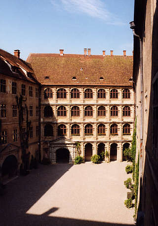 Blick vom Festsaal auf den Nordflügel, dessen viergeschossige, ursprünglich nicht verglaste Loggien-Architektur nach italienischem Vorbild (1570er Jahre) den spätgotischen Kemenatenbau verdeckt.
