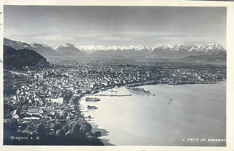 Luftaufnahme der Stadt von Nordwesten, im Hintergrund das Rheintal mit dem Alpenkamm
