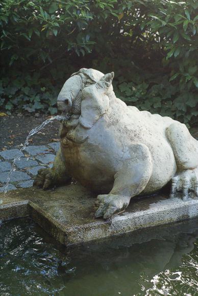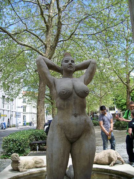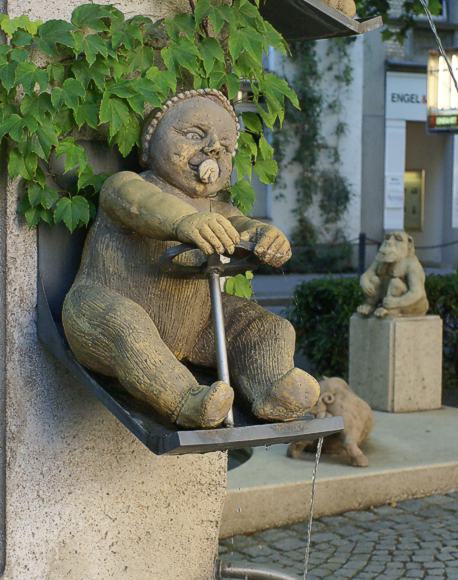 Der 1991 fertiggestellte "Triumphbogen" oder "Laubebrunnen" in der Unteren Laube lässt "in antikisierender Bogen- und Brunnenarchitektur Liebesschönheit, Wasserlust und Jugendkeckheit mit Altersfülle, abgasverängstigten Engeln und den historischen Kutschensturz eines Papstes" zusammentreffen. Hauptthema in der Fülle seiner durchweg ironisch-satirischen Figuren ist der Verkehr: Wohlstandsbürger baden sichtlich selbstzufrieden im Verkehrsfluss, halbnackte Rocker und Affen spucken drauf, schon Kleinkinder halten sich begierig auf Fortschritt am Lenkrad fest, Engel tragen schließlich Gasmasken. Mitten im Brunnen steht die üppig-geformte "Constantia", gierig begafft von alten Männern und Erdferkeln.