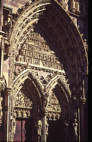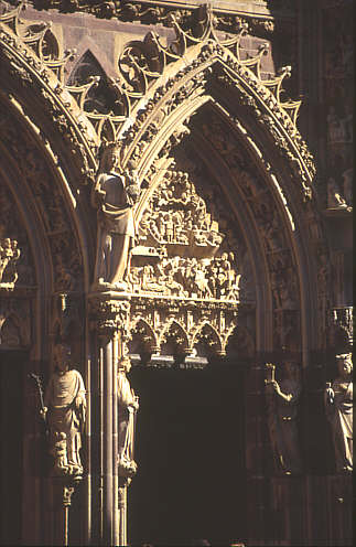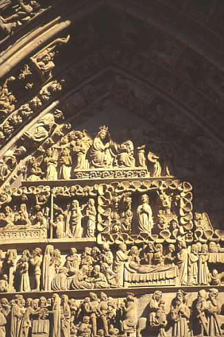 des Westportals enthält in 5 Bildzonen eine Darstellung des Marienlebens. |