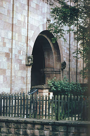 Pfeilerpaar des alten Teils. Am Pfeiler die Skulptur des Bären