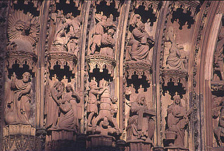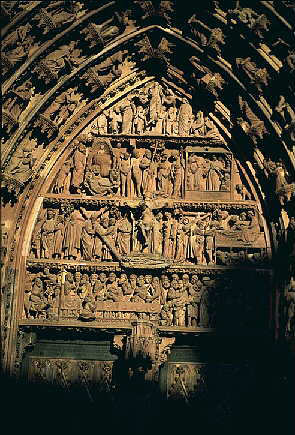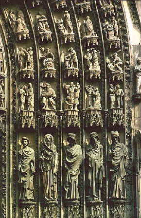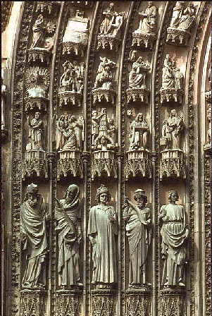 und die abgewandte Synagoge mit verbundenen Augen. Im Vordergrund ein offenes