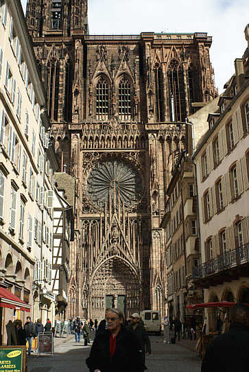 des Hauptportals werden durch einen mit einer Marienstatue geschmückten