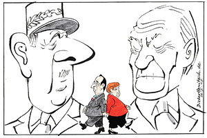 Das Thema des deutsch-französischen Paars bleibt von brennender Aktualität für die Zeichner, und diese greifen zu den verschiedensten grafisch-satirischen Verfahren. Plantu und Dieter Hanitzsch können aufgrund ihres Stils und ihrer Technik als „klassische“ Vertreter ihres Genres betrachtet werden. Plantu, der für die erste Seite von Le Monde viele einschlägige Karikaturen gezeichnet hat, setzt gerne auf Situationskomik und staffiert seine Figuren mit leicht identifizierbaren Attributen aus. Jenseits des Rheins arbeitet Dieter Hanitzsch seit Jahrzehnten für verschiedene Zeitungen, vor allem für die Süddeutsche, und begleitet das politische Geschehen mit scharfem Strich. Vor kurzem haben sie als ganz neuartiges Duo die Zeichenstifte gekreuzt, um das fünfzigjährige Jubiläum des Freundschaftsvertrags zu feiern. Christian Antonelli und Frank Hoppmann setzen mit gleicher Könnerschaft das gleiche satirische Mittel ein: sie stellen so genannte „grandes gueules“ dar, „Großkopfete“, das heißt, sie verpassen ihren Figuren weit überdimensionierte Köpfe. Bei Antonelli erinnert man sich besonders an seine Darstellung des Tandems Kohl-Mitterrand. Der feine, nervöse Strich hat gewiss mit seiner Bewunderung für Saul Steinberg und Ralph Steadman zu tun. Hoppmann hingegen lässt wahre psychologische Porträts in der Tradition eines David Levine entstehen, wenn er mit energischem Strich eine „Ahnengalerie“ der diversen Regierungschefs beider Länder zeichnet.
