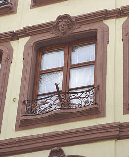 Die Fenster des 1. Obergeschosses sind durch Wellengiebel betont, die skulptierten
