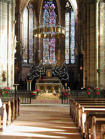 (mit Glasfenstern des 13. Jahrhunderts) mit Hochaltar im Weihnachtsschmuck.