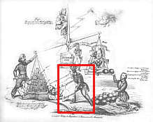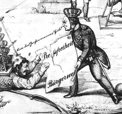 Der Preußenkönig Friedrich Wilhelm IV. reicht dem deutschen Michel als "Zeichen seiner Huld" Pressefreiheit und Bürgerwehr, die allerdings bereits eingerissen und damit bereits beschädigt ist. Friedrich Wilhelm IV. tarnt sein wahres Gesicht mit einer Maske. |