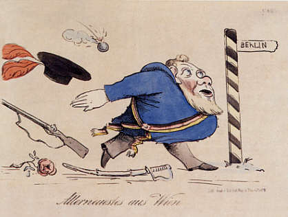 Robert Blum wird hier dargestellt, wie er angesichts einer Kugel die Waffen wegwirft und sich in Richtung Berlin in Sicherheit bringt. Das Blatt ist zweifellos entstanden, bevor Blums Hinrichtung bekannt wurde.