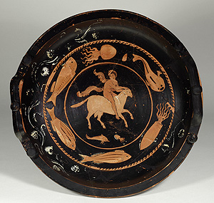 Kylix, Phrixos-Maler, Apulien (Ceglie), 3. Viertel des 4. Jahrhunderts v. Chr. Ton, H. 17,5 cm, B. 47,5 cm, T. 46,8 cm