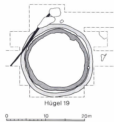 Grab 19 mit zwei konzentrischen Kreisgräben, die einen älteren Hügel (dunkel) und seine Erweiterung (hell) kennzeichnen.