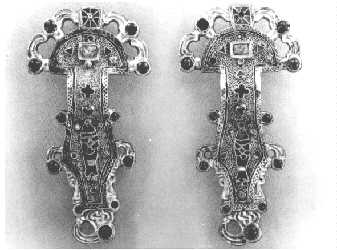 Fibeln waren für die Menschen vor rund anderthalb Jahrtausenden eines der wesentlichen Zubehörstücke zur Kleidung und wurden erst überflüssig, als man Knopf und Knopfloch erfunden hatte. Dann aber wurde die Fibel zu dem, was sie heute noch ist: Sicherheitsnadel auf der einen Seite, Schmuckbrosche auf der anderen Seite. Damals aber war die Fibel beides zusammen - und entsprechend kostbar sind manche Stücke gearbeitet. Sie traten in der Form der Bügel- und Scheibenfibeln auf, die ein Manteltuch vor der Brust oder auf der Schulter zusammenhielten. Als sie nicht mehr als echter Verschluß belastet wurden, traten die Kleinfibeln an die Stelle der Bügelfibeln und wurden mehr und mehr zum Schmuckstück. Kennzeichen der Männergräber waren die Waffen - Lang- und Kurzschwert, Speer und Schild - die ebenfalls im Zusammenhang mit der Bekleidung der Franken vorgestellt wurden.