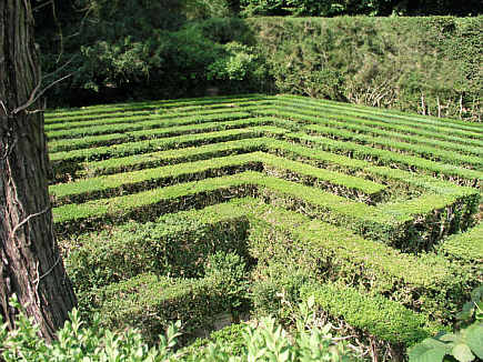 Auch das Labyrinth mit seinem verschlungenen und undurchsichtigen Wegesystem ist ein Sinnbild des irdischen Lebens. Der Labyrinthgarten ist hier vom Aussichtsturm aus gesehen.