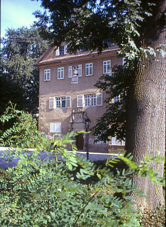 wohl nur der wuchtige Rundturm hinter dem Gebäude im Park,