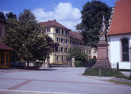Das Neue Schloss ist ein aus zwei rechtwinklig aneinanderstoßenden Flügeln bestehender Bau aus der Mitte des 19. Jh. An der Außenwand sind fünf gotische Wappensteine eingemauert, die noch vom alten Schloss stammen sollen.