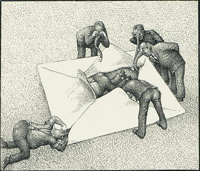 Als der Sohn im Ferienlager einen Brief an seine Tante in den USA nicht abschicken darf, bringt der Künstler seine Empörung zu Papier. An eine Veröffentlichung der Zeichnung ist in der DDR nicht zu denken.