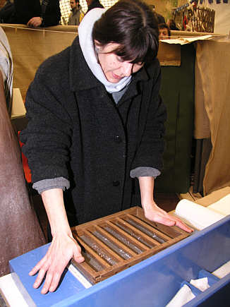 Das Sieb mit dem Papierfilz wird auf einer Unterlage abgelegt, auf der der Filz dann zurückbleibt. Wegen der wiegenden Bewegung nennt man diesen Vorgang gautschen