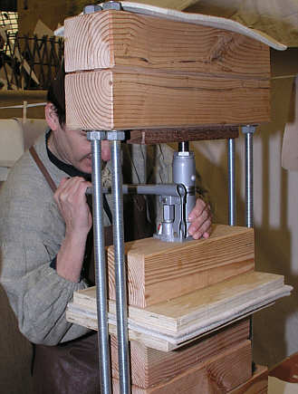 Der nötige Andruck wird hier mit einem einfachen hydraulischen Wagenheber, der zwischen die Lagebretter und den Deckbalken geklemmt wird, erzeugt.