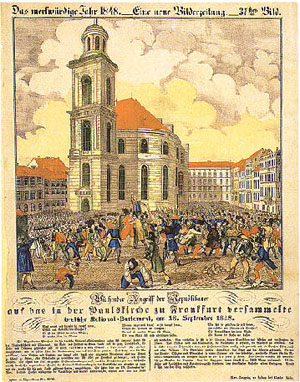 "Wütender Angriff der Republikaner auf das in der Paulskirche versammelte deutsche Nationalparlament, 18. September 1848". Neuruppiner Bilderbogen, 1848, Lithographie, koloriert. Frankfurt/M., Historisches Museum. Aus der Ausstellung "Revolution der deutschen Demokraten in Baden", Karlsruhe (Kat.-Nr. 326)