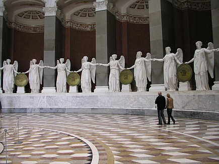 Innenraum 17 geflügelte Viktorienpaare berühren sich mit der äußeren Hand und tragen mit den inneren Hand vergoldete Eisenschilde mit den Namen und Daten der gegen Napoleon geführten Schlachten. Die Schilde wurden aus den Beutekanonen gegossen.