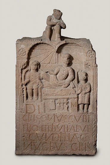 Grabstein des Girisonius und seiner Frau Bibulia aus Obernburg. Das Ehepaar war einheimischer Herkunft und hatte es im Kastellvicus zu einigem Wohlstand gebracht. 2. Jh. n. Chr.